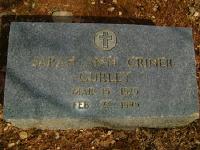 Sara Ann Criner was born on 14 March 1825 at Madision County, Alabama.1,2 She and William Rutledge Gurley obtained a marriage license on 6 January 1844 at Madison County, Alabama.3 Sara Ann Criner married William Rutledge Gurley, son of John Gurley and Matilda Sharp Rutledge, on 11 January 1844 at Madison County, Alabama.4,5,3 Sara Ann Criner inherited $966.46 from her fathers estate on 13 July 1846 at Madison County, Alabama.6 She was on the census of 2 November 1850 at Madison County, Alabama, as Sarah A. Gurley Sarah was a 25 year old female who was born in Alabama.1 She died on 27 February 1895 at Madison County, Alabama, at age 69.2 She was buried after 27 February 1895 at Gurley Cemetery, Gurley, Madison County, Alabama.2