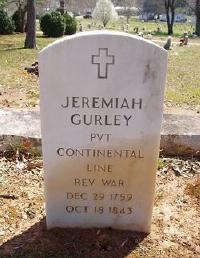 Obituary from Huntsville, AL Democrat - Nov. 16, 1843. - [S780] Jeremiah Gurley 1759-1843 FindAGrave, online FindaGrave.com, Find a Grave, database and images (https://www.findagrave.com : accessed 19 July 2020), memorial page for Pvt Jeremiah Gurley (29 Dec 1759–18 Oct 1843), Find a Grave Memorial no. 10758965, citing Gurley Cemetery, Gurley, Madison County, Alabama, USA ; Maintained by Jason Presley (contributor 46598252) .