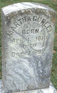 Martha Mullings was also known as Martha Mullins.2 She was born on 1 April 1810 at South Carolina.3 She married Aaron Gurley, son of West Gurley, on 30 December 1828 at Blount County, Alabama.1,4 Martha Mullings and Aaron Gurley were involved in a land transaction when they transfered a deed to Joseph B. Glenn on 25 October 1844 at Jefferson County, Alabama.5 Martha Mullings died on 19 October 1892 at Greene County, Missouri, at age 82.6 She was buried after 19 October 1892 at Mt. Comfort Cemetery, Greene County, Missouri.6