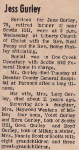 - [S664] Pioneer Families of Henderson County, TN: Isham Gurley Family, online genealogytrails.com/tenn//henderson/pioneergurley.html, Notes by Betty Hughes. Jess (m. Lucy Kennedy, they lived on the old Gurley place near the cemetery and are buried there).