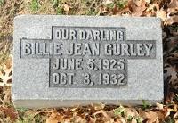 Billie Jean Gurley was born on 5 June 1925 at Grayson County, Texas.1 She died on 3 October 1932 at Grayson County, Texas, at age 7.1 She was buried after 3 October 1932 at West Hill Cemetery, Sherman, Grayson County, Texas.1