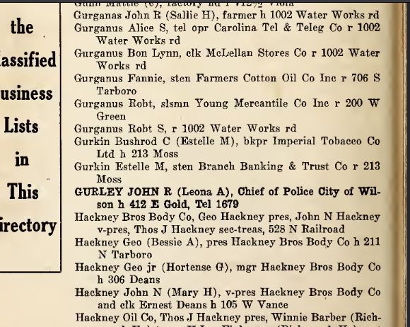 The fist Police Training Program was started in Wilson in 1935. between 1927 and 1939.6 As of 1930, John Rufus Gurley lived at 412 E Gold, Wilson, North Carolina.7 He died on 22 February 1939 at Wilson, North Carolina, at age 54; of uremic poisoning, influenza.8,2